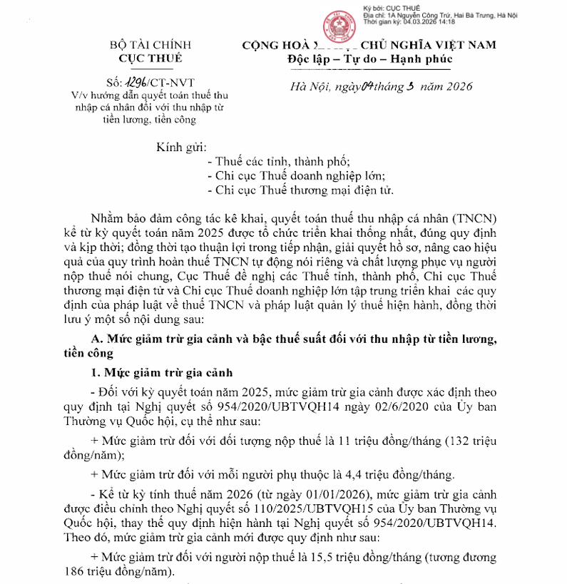 Cục Thuế Hướng Dẫn Quyết Toán Thuế TNCN: Điều Chỉnh Mức Giảm Trừ Gia Cảnh Và Lộ Trình Mới Từ 2026