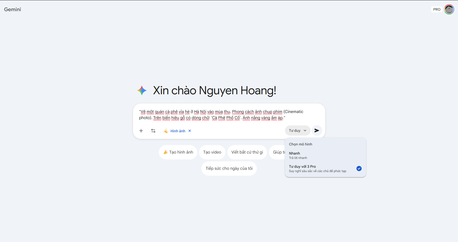 Tại giao diện chính, ở góc trên bên trái màn hình, bạn sẽ thấy menu chọn mô hình. Hãy đảm bảo bạn đang chọn Gemini 3 Pro (hoặc phiên bản có biểu tượng Nano Banana nếu Google đã cập nhật icon). Lưu ý: Các phiên bản cũ (Gemini Flash/Basic) sẽ không hỗ trợ tạo ảnh chất lượng cao.