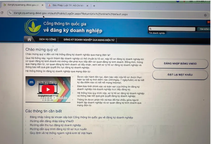 Người nộp hồ sơ sử dụng Tài khoản Định danh Điện tử của mình để đăng nhập vào Cổng thông tin quốc gia về đăng ký doanh nghiệp.