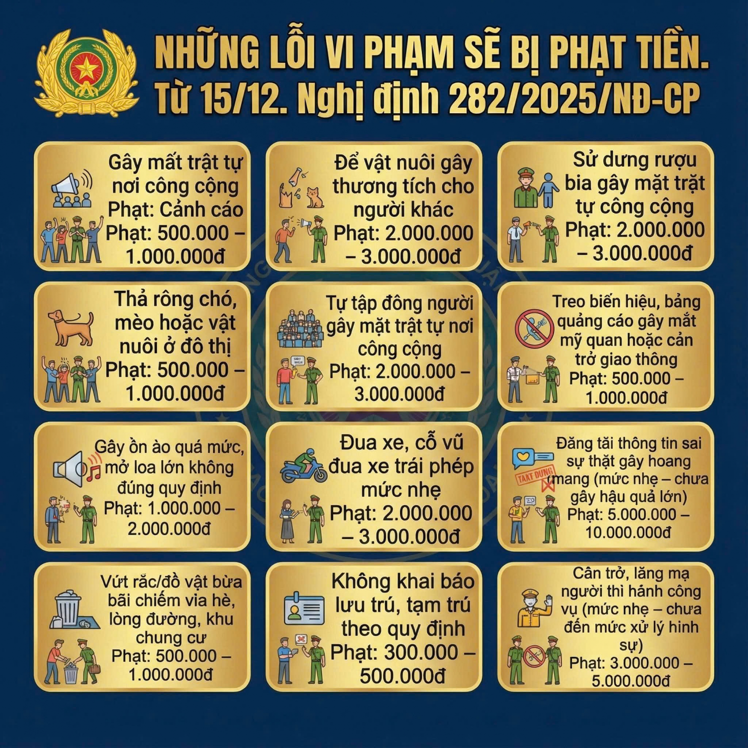 Các lỗi nhẹ hơn như gây mất trật tự tại nơi công cộng (lần đầu) có thể bị Cảnh cáo hoặc phạt đến 500.000 đồng; hay thả rông chó, mèo ở đô thị bị phạt từ 500.000 đến 1.000.000 đồng.
